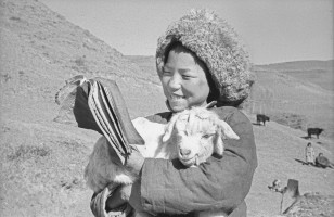 1952年,青海湟中县上五庄回民马有义的儿子马伊斯麻,今年十四岁了,在旧社会他祖组辈辈都是睁眼瞎。土改后,村里办起冬学,马伊斯麻有了上学的机会。这是他在放羊时复习功课。 茹遂初摄