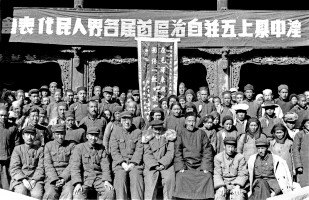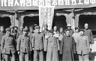 1952年,青海湟中县上五庄回族自治区,召开各界人民代表会议,成立了自冶区人民政府。青海省主席赵寿山(左起第四人)和民族、宗教界人士前往祝贺。 茹遂初摄