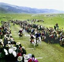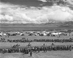1963年,过去的赛马会对牧民来说是一次难以避免的灾难,原西藏地方政府利用赛马大会的机会向牧民征收各种苛捐杂税,不少藏胞被逼得家破人亡。民主改革后,赛马大会真正成为牧民欢乐的节日。图为牧民在赛马会上表演各种马技。茹遂初摄于当雄牧区