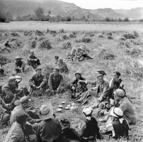 1963年,西藏,帮助群众发展生产,是解放军的光荣传统,图为解放军在帮助藏胞秋收休息肘部队首长和藏胞亲切交谈。茹遂初摄于乃东县泽当