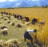 1965年,西藏,翻身农奴迎来又一个丰收年,图为互助正在收获庒稼。 茹遂初摄于堆龙德庆