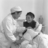 1965年,西藏,过去只能在牛棚马厩生孩子的藏族劳动妇女,现在都可以兔费去医院生育。贪苦农奴出身的穷达过去生了三个孩子,但都在刚刚生下来就死去了。今年七月间穷达在自治区人民医院平安生下一个男孩。茹遂初摄