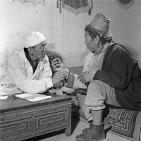 1965年,西藏,拉萨藏医院副院长贡噶平措在藏胞看病。 茹遂初摄