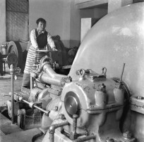1965年,西藏,拉萨电厂农奴出身的藏族女工,共青团员索兰曲珍在调整水轮机。 茹遂初摄