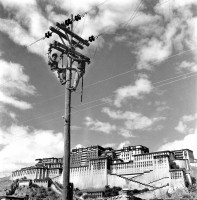 1965年,西藏,随着近代工业的出现,在汉族工人的帮助下,第一代藏工人正成长,现在西藏地区各个工业部门都有藏族工人。图为拉萨电厂的线路维修工达瓦和米玛在检修路。   茹遂初摄