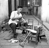 1964年,上海,民警胡庆惠为了给居民服务,还特地拜师学了一手木匠手艺,居民或里弄里的集体单位(托儿所、食堂等)的门窗傢俱坏了,他都主动上门修理。图为他正给托儿所修橙子。  茹遂初摄