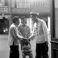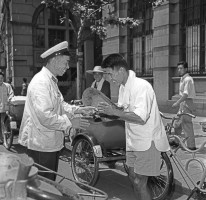 1964年,上海,  在炎热的夏天,民警主动给三轮车工人送水。       茹遂初摄
