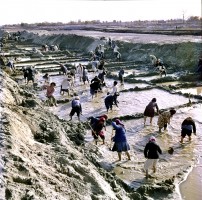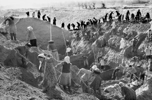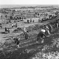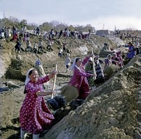 1964年,新疆和田,于田县红旗公社社办农场的社员们正在挖掘沙丘,开辟农田。1958年以来,和田专区的维吾尔族农民,在党的领导下,向荒地开展大进军。几年来在塔克拉玛干大沙漠的边缘开垦了七十余万亩荒地,建立了三十多个社办农场。茹遂初 摄