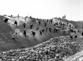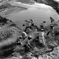 1964年,新疆和田墨玉县正在施工中的南坪水库。这个水库建成后可使新开垦的数万亩荒地的浂溉得到可靠的保障。 茹遂初摄