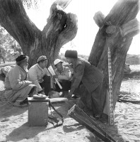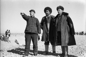 1964年,新疆和田,于田县副县长汉族干部樊建福(左1),几年来勤勤恳恳,全心全意的领导維吾尔族农民兴修水利,改造自然,深受维吾尔族人民爱戴,被誉为“戈壁滩上钢县长”。茹遂初摄