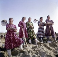 1964年,新疆和田,战斗在水利建设工地上的女青年,左起墨玉县火箭公社六好社员阿西汗、康玛尔汗、埃吉汗、肉孜汗和努尔汗。 茹遂初摄