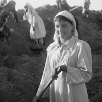 1964年,新疆和田, 奋战在墨玉县马奎亚大渠建设工地上的维吾尔姑娘。茹遂初摄