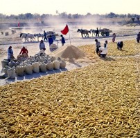 1964年,新疆和田,皮山县的跃进公社1957年以前粮食还不能自给,每年都要由国家供应数十万斤粮食。1958年公社化以后,生产有了很大的发展,粮食自给有余,每年都有余粮出售给国家。图为跃进公社第四生产大队的打谷场 。 茹遂初摄