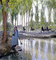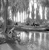 1964年,新疆和田绿洲。1958年以来和田地区共修建总长达一万七千公里的干、支、斗渠,改变了和田地区干旱缺水的面貌。就是枯水季节,绿洲到处都可以看到潺潺流水。 茹遂初摄