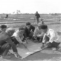 1964年,新疆和田,墨玉县五一人民公社的领导干部和技术人员,正在研究农田水利全面规划方案。 茹遂初摄