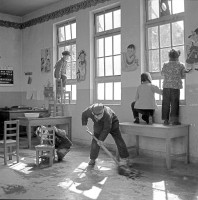 1966年,天津东门里小学少先队员在天津市少年儿童图书馆打扫卫生。  为了培养孩子们为人民服务的思想,东门里小学少先队经常组织队员参加公益劳动。茹遂初摄