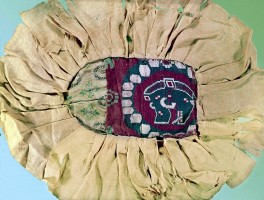 1972年,联珠熊头纹锦覆面,唐,新疆吐鲁番阿斯塔那北区138号墓出土,新疆维吾尔自治区博物馆藏。茹遂初摄