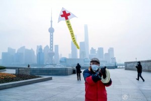 1月30日,外滩老顾戴着口罩放飞一只新做的“抗击新冠病毒”的风筝。任国强 摄