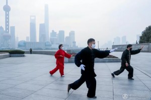 1月30日,一早三位戴着口罩的市民在外滩打太极。任国强 摄