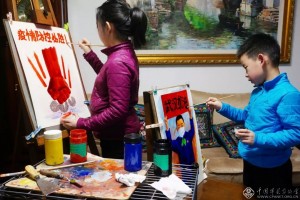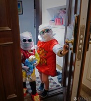 2月12日,面对疫情,足不出户,和外孙女外孙一起拿起画笔,为时代画像,为防控添色。汤国庆 摄