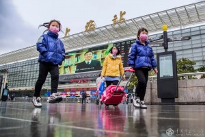 《疫情关键时期 民众加强防护》2月7日,铁路上海站南广场。随着新冠肺炎疫情防控宣传力度的加大,广大群众自身防护意识大大增强,图为正在出站的双胞胎母女,口罩是必备的防护措施。胥昆德 摄