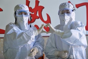 张掖市某发热门诊医护人员做“爱心”手势。郑耀德 摄