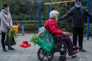 一位老人开着自己的轮椅下楼购买蔬菜,大海请老人到队伍最前面先去结账,大海告诉老人,以后如果您不方便下楼,需要什么我就给您送过去。