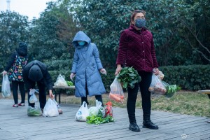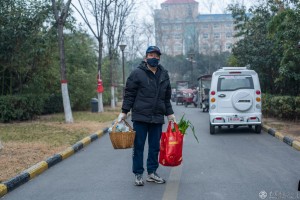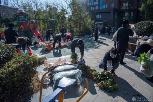 早晨,小区的居民们陆续的起床下楼到“蔬菜广场”采购当天最新鲜的蔬菜,长长的队伍几乎排满了整个小区,人与人间隔两米以上,只有一两名“插队的人”,大家一致同意这个插队是必须的。