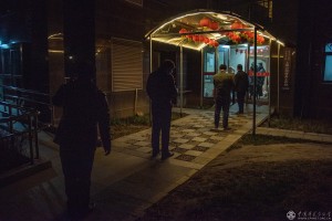 为了防止人员过于聚集,业委会及物业想了很多居民生活保障方案,到了晚上开始供应肉制品。图为社区居民正在排队购买需要的肉制品。