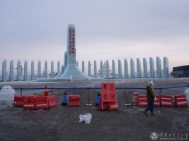 2月15日,新建成的长春冰雪大世界,冰雕渐渐融化,小朋友在“景区关闭”公告前踱来踱去。