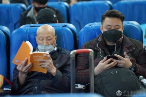 2月19日,长春火车站候车室内,两代人用不同方式阅读,时间变得如此漫长。