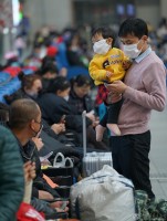 2月19日,长春火车站候车室内,年轻爸爸抱着戴成人口罩的小孩。