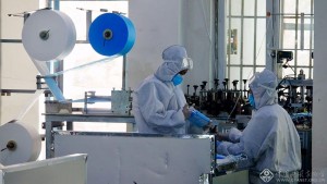 2月26日,青海晶珠藏药集团新引进的口罩生产线正在生产中,近日该公司购买的4条防护口罩生产线陆续投产。张海东 摄
