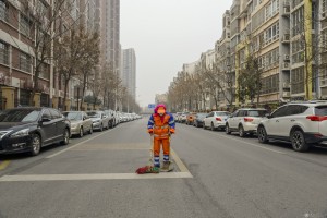 2月1日,空荡荡的街道上,未央宫街道办保洁员依旧坚守岗位,清扫保洁。孟宪军 摄