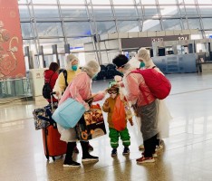 2月3日,受疫情影响,春运返程西安国际机场T3航站楼一家老小出行时戴上了口罩,防护雨披,旅客们的防范意识越来越强。王丽娜 摄