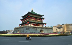 2月8日,西安钟楼下,一位快递小哥疾驰在送货的路上。 任靖华 摄
