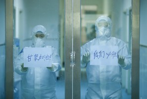 2月2日,医务人员隔窗送祝福,最美逆行者,甘泉加油,我们必胜! 肖豫军 摄