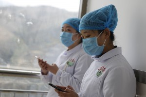 2月3日,进入隔离病区前的紫阳中医院护士徐青和任萍媛,正在给家人发微信。陈梅 摄