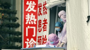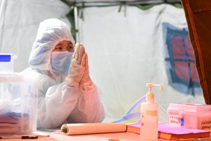 2月10日,预检分诊值夜班的护士在祈盼着疫情快点结束。宁来生 摄