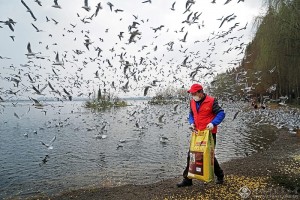 2月27日,昆明海埂湖滨路,护鸥志愿者正在投喂海鸥。 蒋玲 摄