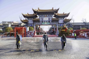 2月4日,工作人员正在对官渡古镇全面消毒。王正鹏 摄