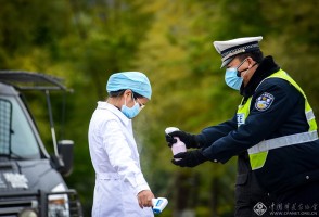 2月9日,值班民警和医务人员正相互帮助消毒。周利东 摄