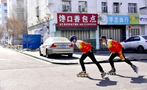 3月1日,新疆石河子市。五小区居民父子俩在小区内溜旱冰,锻炼身体。杨银学摄