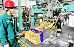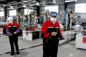 3月6日,新疆阿拉尔。兵团第一师阿拉尔市青松化工有限责任公司员工在自动灌装生产流水线上监控产品聚氯乙烯树脂质量。孙国权摄