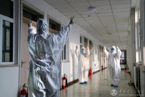 2月16日,奎屯医院护士长牛双双带领护士姐妹们昼夜奋战在抗击疫情第一线,每天用手势互相鼓励加油。付剑锌摄