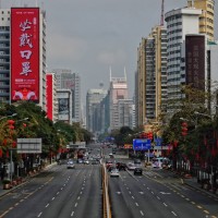 2月12日,深圳市福田区深南中路华强北街道某大楼上亮出“必戴口罩”宣传语。王琛 摄