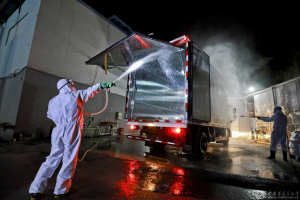 3月2日,深圳市中心人民医院,消毒员即刻对运送医疗废物的车辆进行全面消毒,切实做好疫情防控工作。彭威 摄