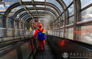 1月30日,北京西站,工作人员正在对电梯进行消毒。魏刚 摄