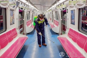1月29日,北京大兴,工作人员对地铁车厢内进行全面消毒。赵冬晨 摄