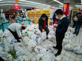 2月8日,家乐福超市工作人员正在打包网购订单。郑永康 摄